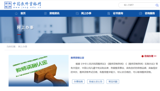 - 點擊首頁 “網(wǎng)上辦事”欄目下“教師資格認(rèn)定”服務(wù)入口