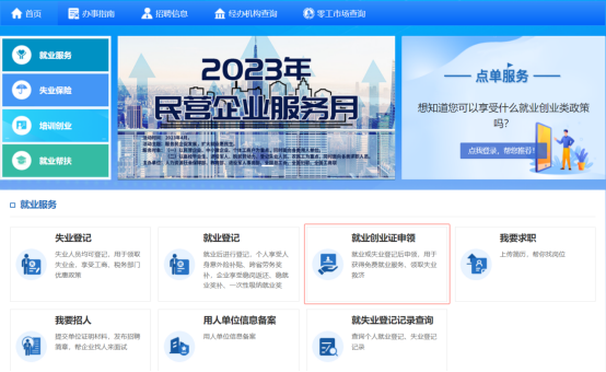 ①登錄福建省公共就業(yè)服務(wù)網(wǎng),選擇“就業(yè)創(chuàng)業(yè)證申領(lǐng)”;