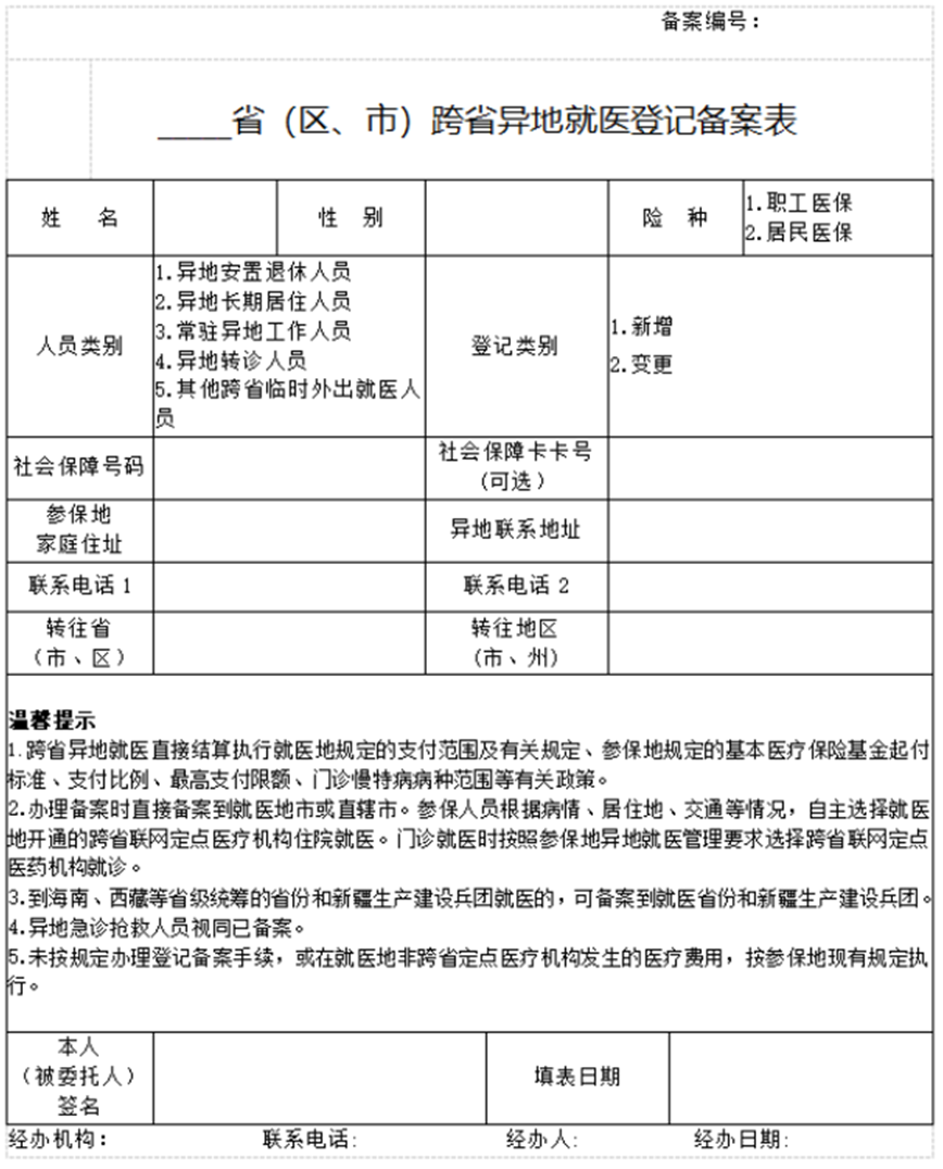 2.《____?。▍^(qū)、市)跨省異地就醫(yī)登記備案表》(以下簡稱備案表,備案表由醫(yī)保經(jīng)辦機構提供,參保人填寫);