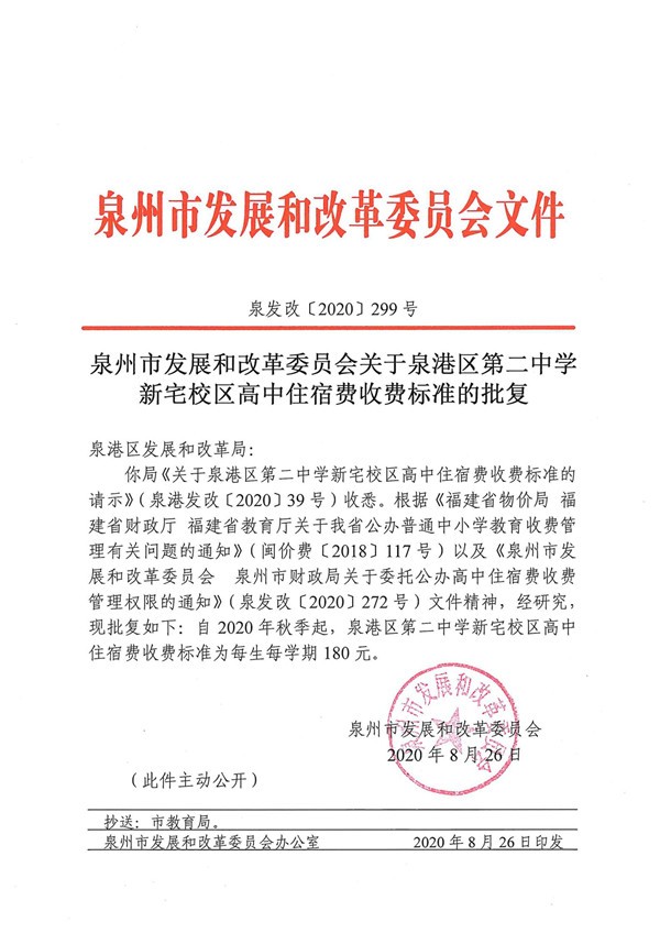 《泉州市發(fā)展和改革委員會(huì)關(guān)于泉港區(qū)第二中學(xué)新宅校區(qū)高中住宿費(fèi)收費(fèi)標(biāo)準(zhǔn)的批復(fù)》(泉發(fā)改〔2020〕299號(hào)) |